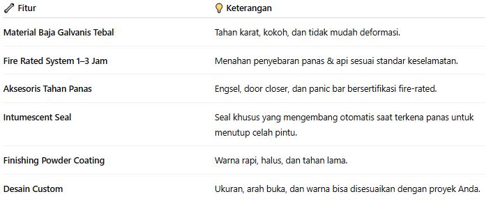 Fire Steel Door (Pintu Tahan Api) adalah pintu besi khusus yang dirancang untuk menahan panas, api, dan asap dalam jangka waktu tertentu (1–3 jam).
